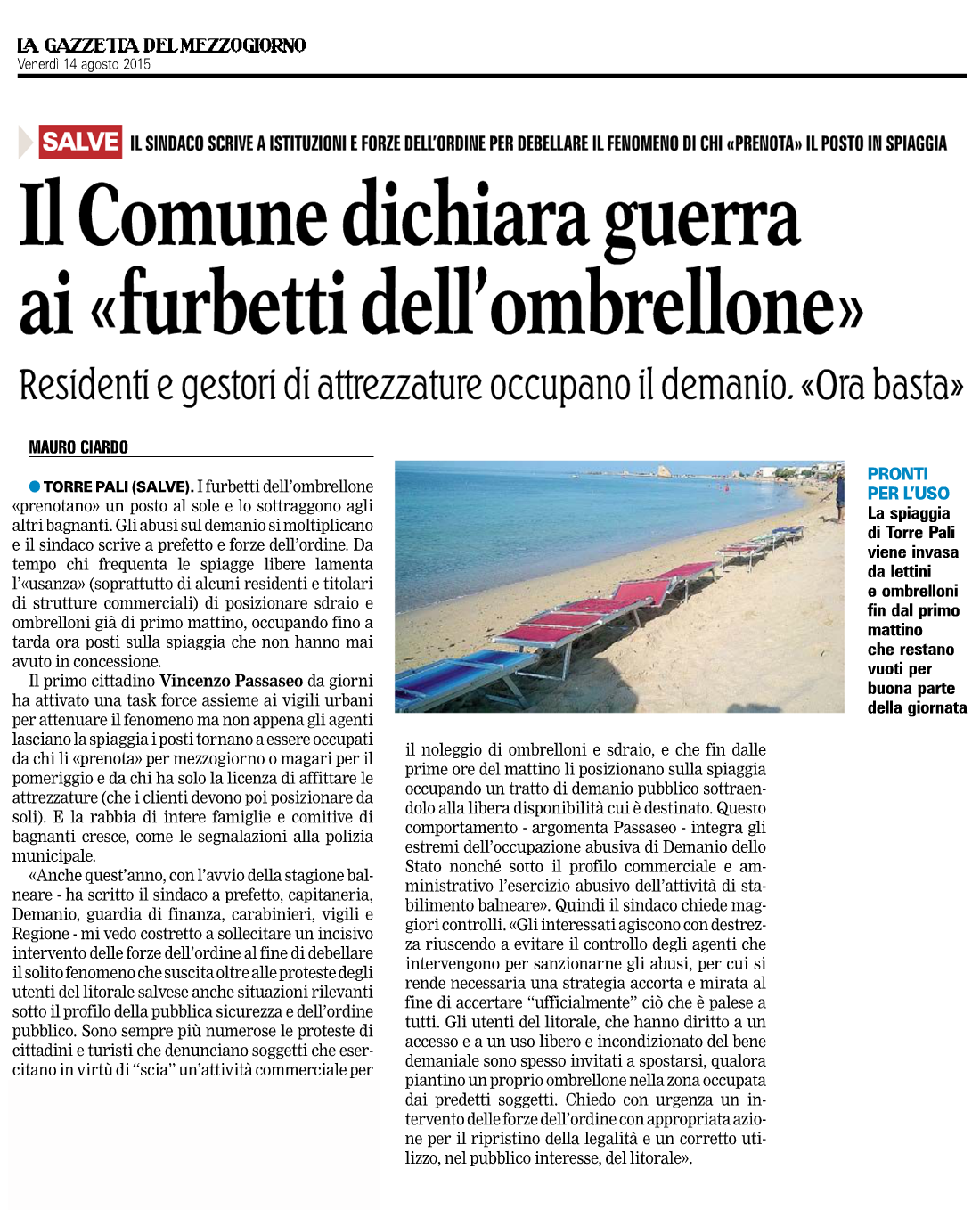 Caos in spiaggia - L'articolo del "Quotidiano" di Martedì 21 Luglio